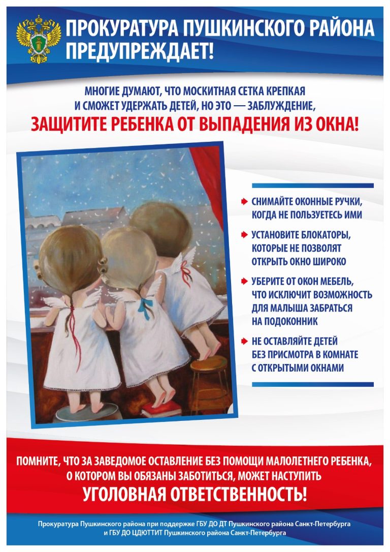 Уважаемые родители! С приближением лета повышается риск падений детей из открытых на проветривание окон многоэтажных домов. Ежегодно, с наступлением теплых дней количество таких несчастных случаев увеличивается. Основная причина – беззаботность и беспечность взрослых, которые оставляют без присмотра малолетних детей вблизи…