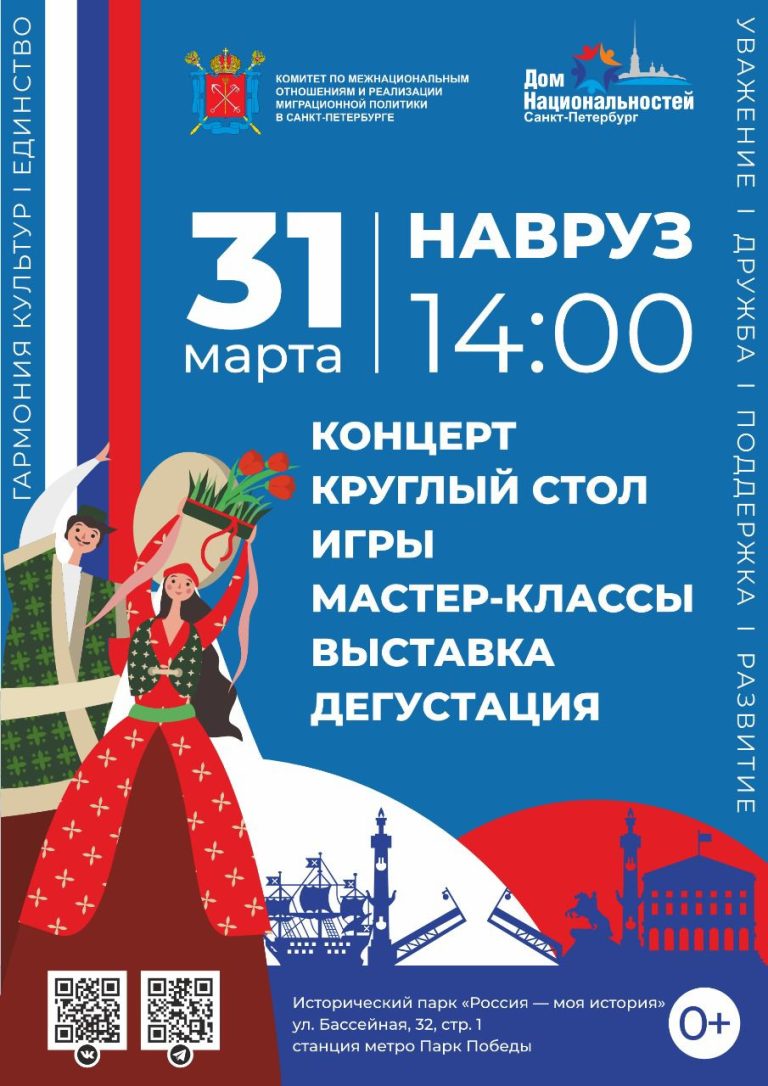 СПб ГКУ «Санкт-Петербургский дом национальностей» проводит мероприятие, посвященное празднику «Навруз», которое пройдет 31.03.2024 в 14.00 в историческом парке «Россия — моя история» (ул.Бассейная, д.32, корп.1).